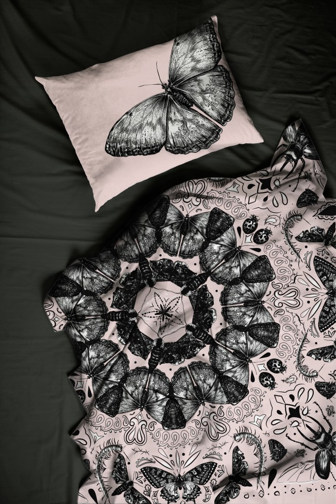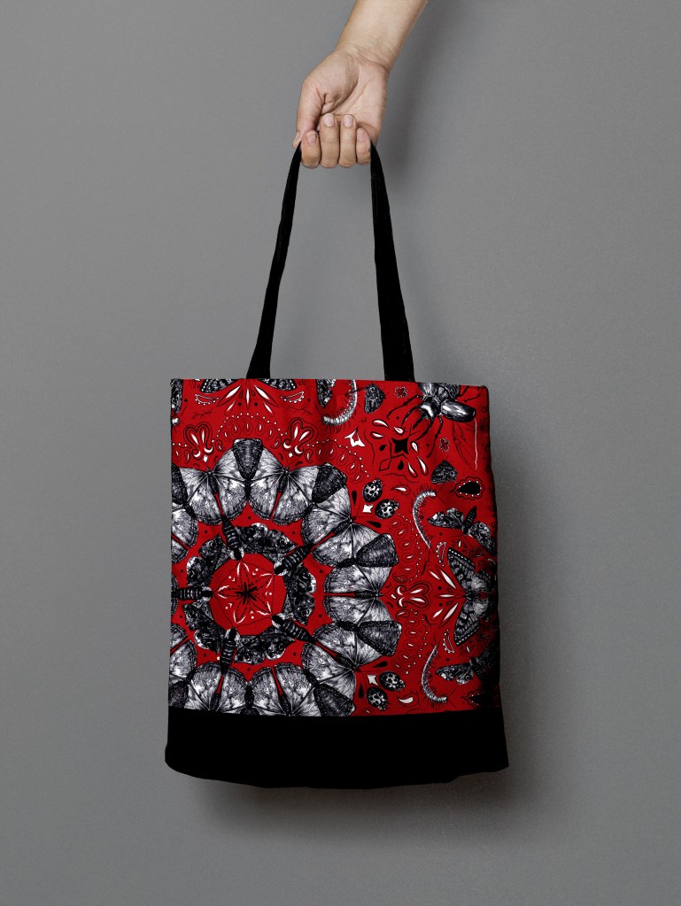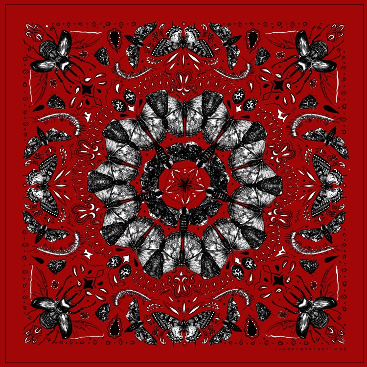 Se basa en la ornamentación de las pañoletas clásicas en la que intervienen los insectos para cumplir la simetría de sus líneas principales. A parte de ser un pañuelo de semiseda de menor formato que Peacock’s eyes y Life, knots and death; con este diseño se confeccionaron tres totebags a mano que fueron sorteadas entre los seguidores de Instagram (www.instagram.com/rebecavalenciano).