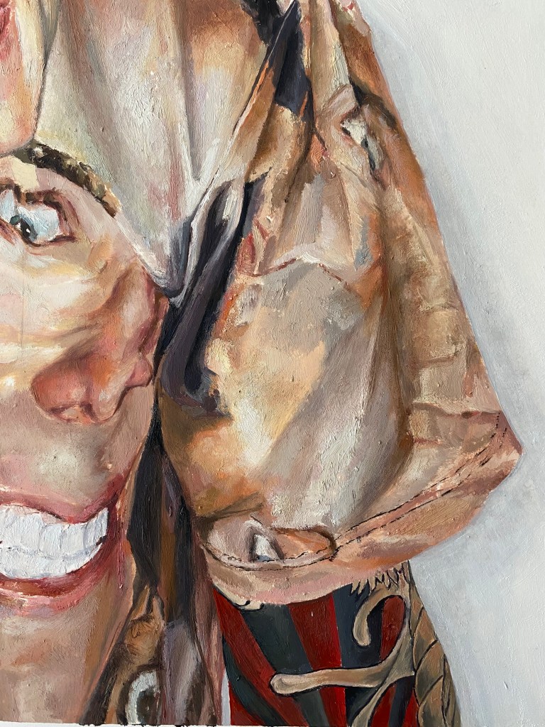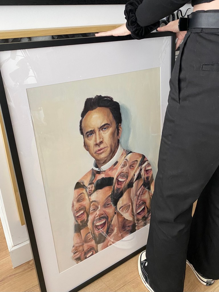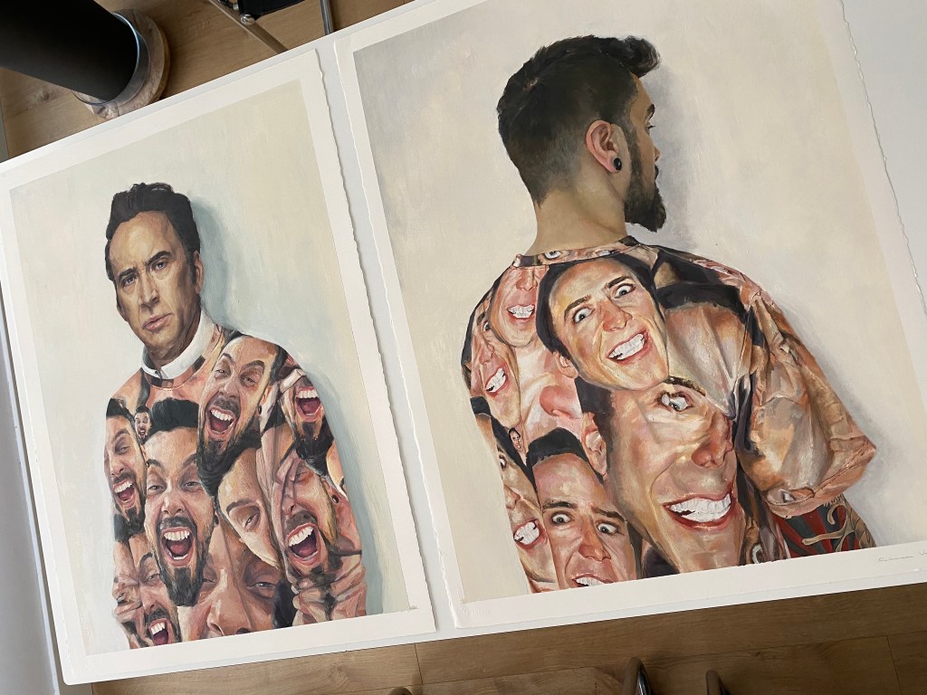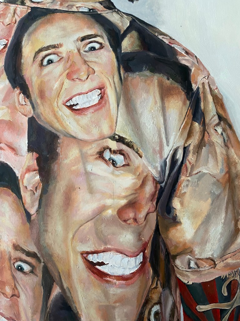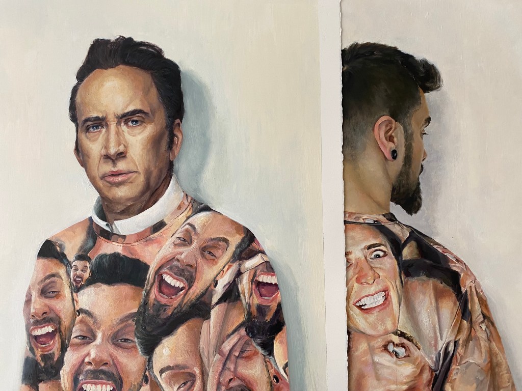 Díptico temático nacido de la representación de un meme en un retrato (la primera camiseta que encontré de Nicolas Cage) y convertido en la venganza conceptual para el mismo y un juego de repetición para mí. Ambos retratos son óleo sobre papel Arches de 300gr, 60x80cm.
