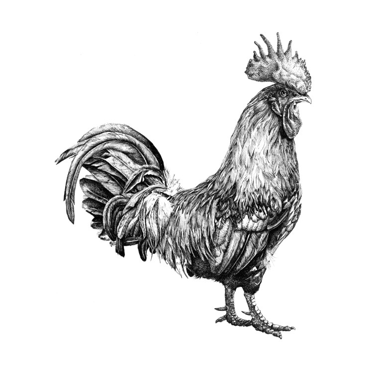 La ilustración se basa en una composición vectorial elaborada a partir de un dibujo a plumilla de un gallo, junto a la incoporación del logotipo de dicha marca y el lettering.
