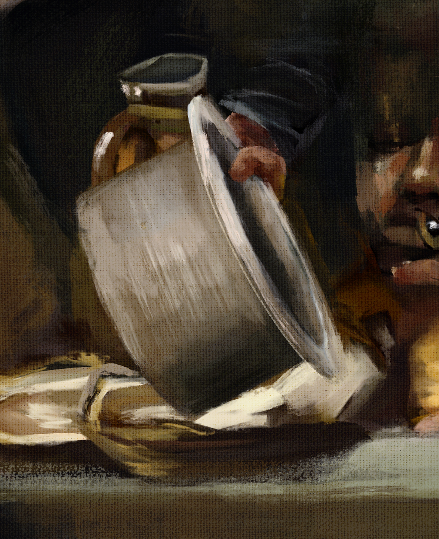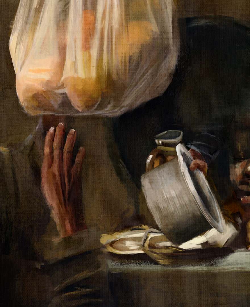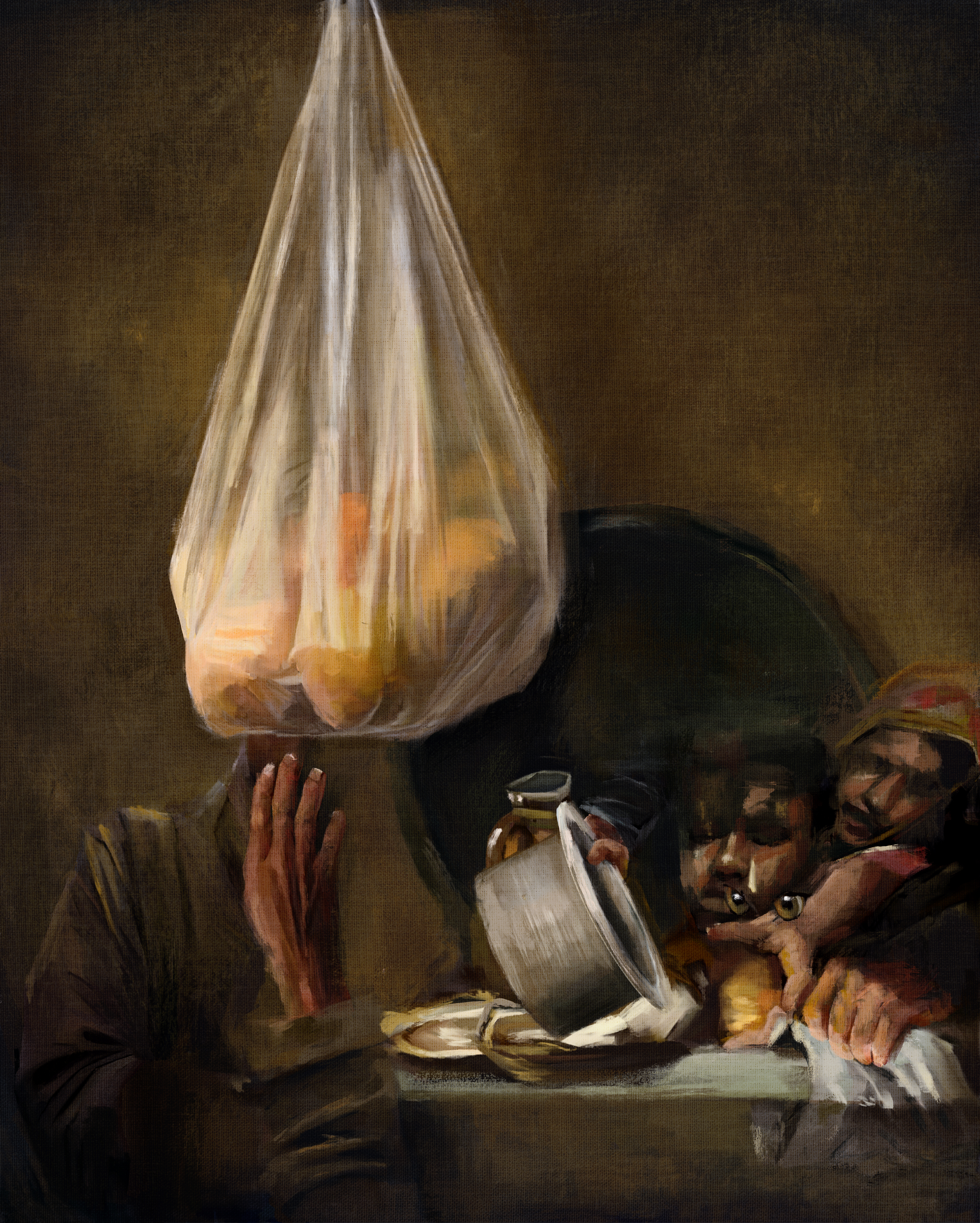 «Lo que nos mira» como versión de «Bodegón con gato y raya» de Jean Baptiste Simeón Chardin, 1728. Esta etapa en la que el pintor francés empieza a romper la quietud de sus naturalezas muertas introduciendo animales en movimiento, ha despertado este drástico cambio de personajes en el que la quietud y la acción se asignan por condición social; agitando la cuestión de nuestro papel como espectadores en el contexto actual.
