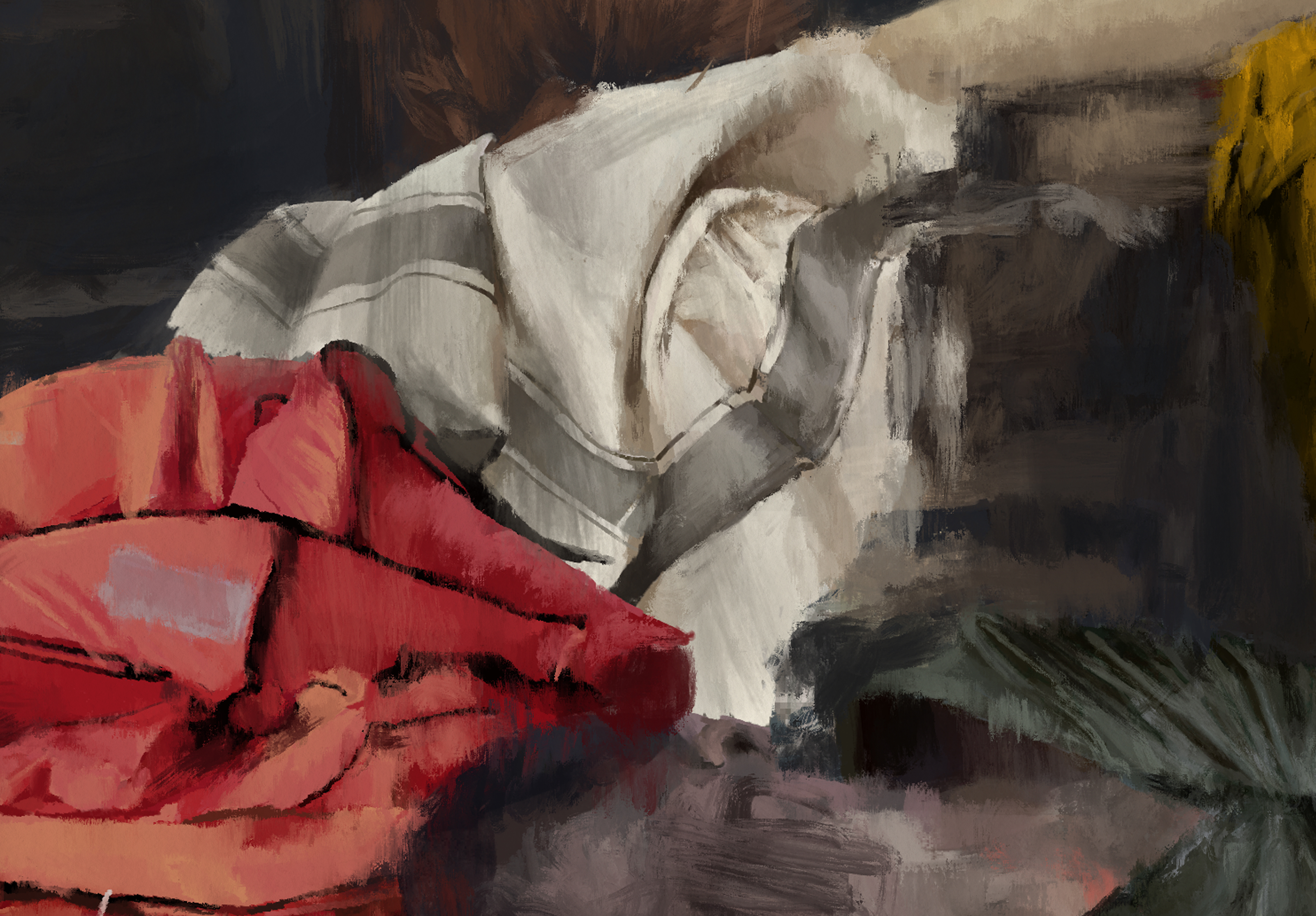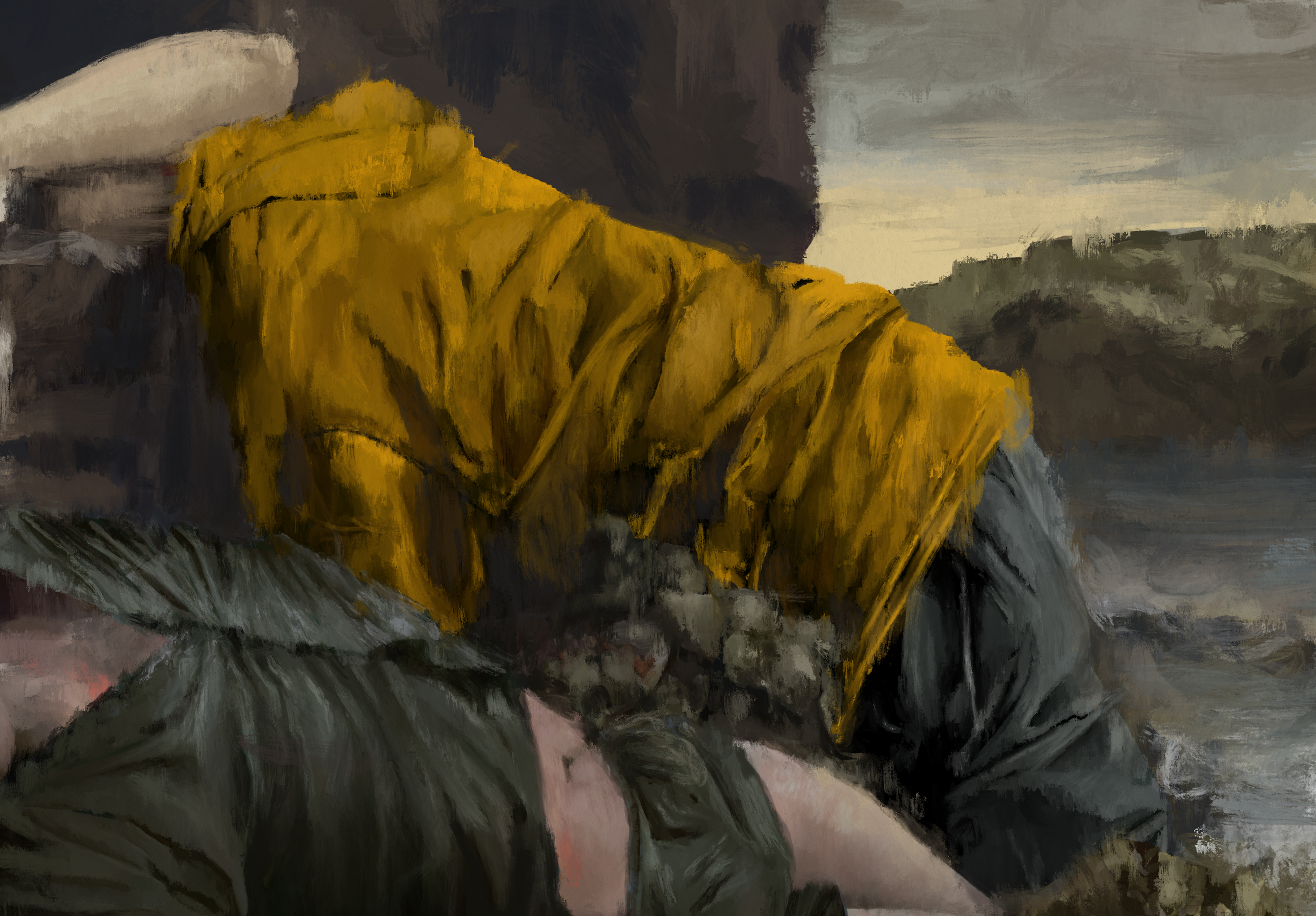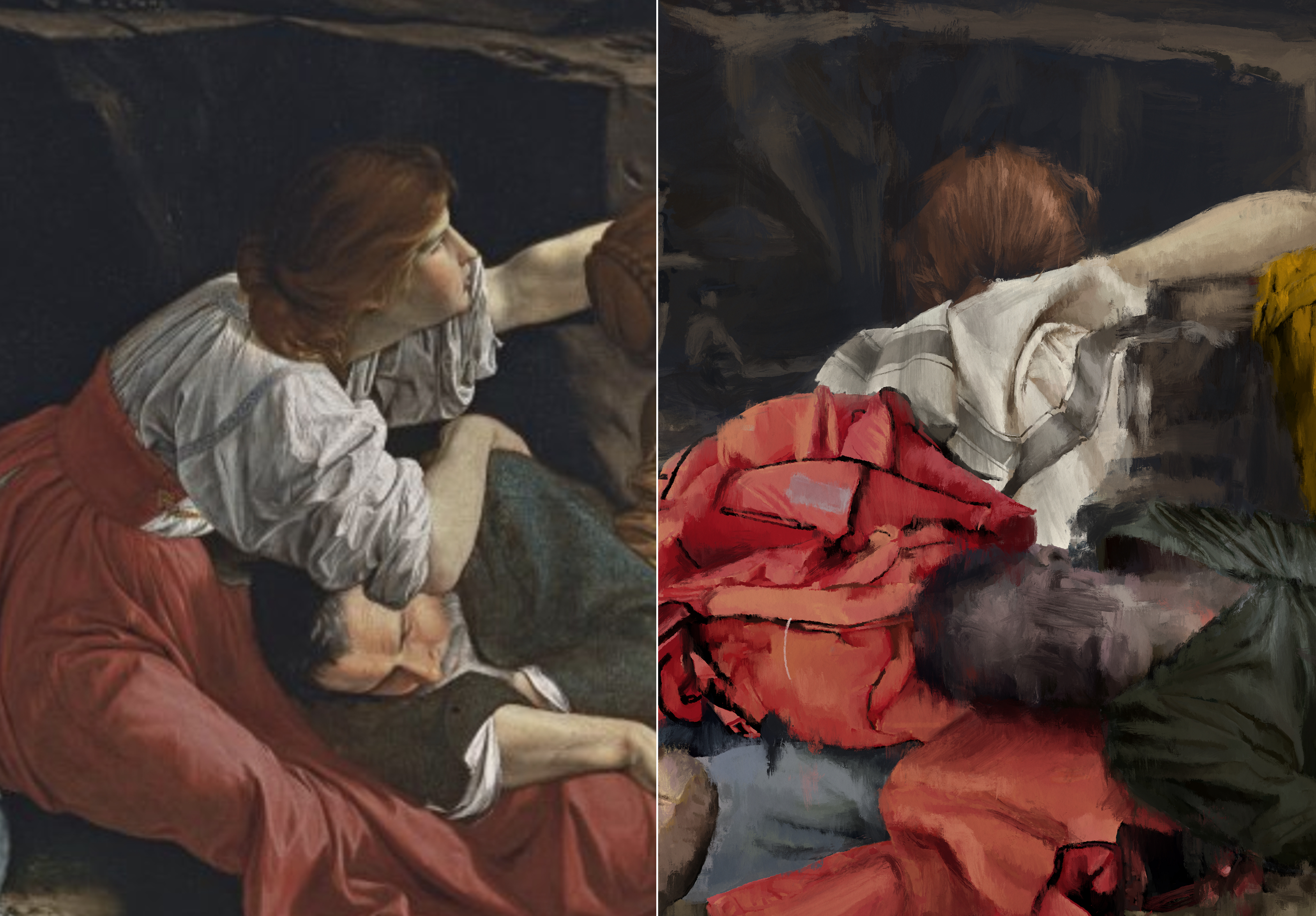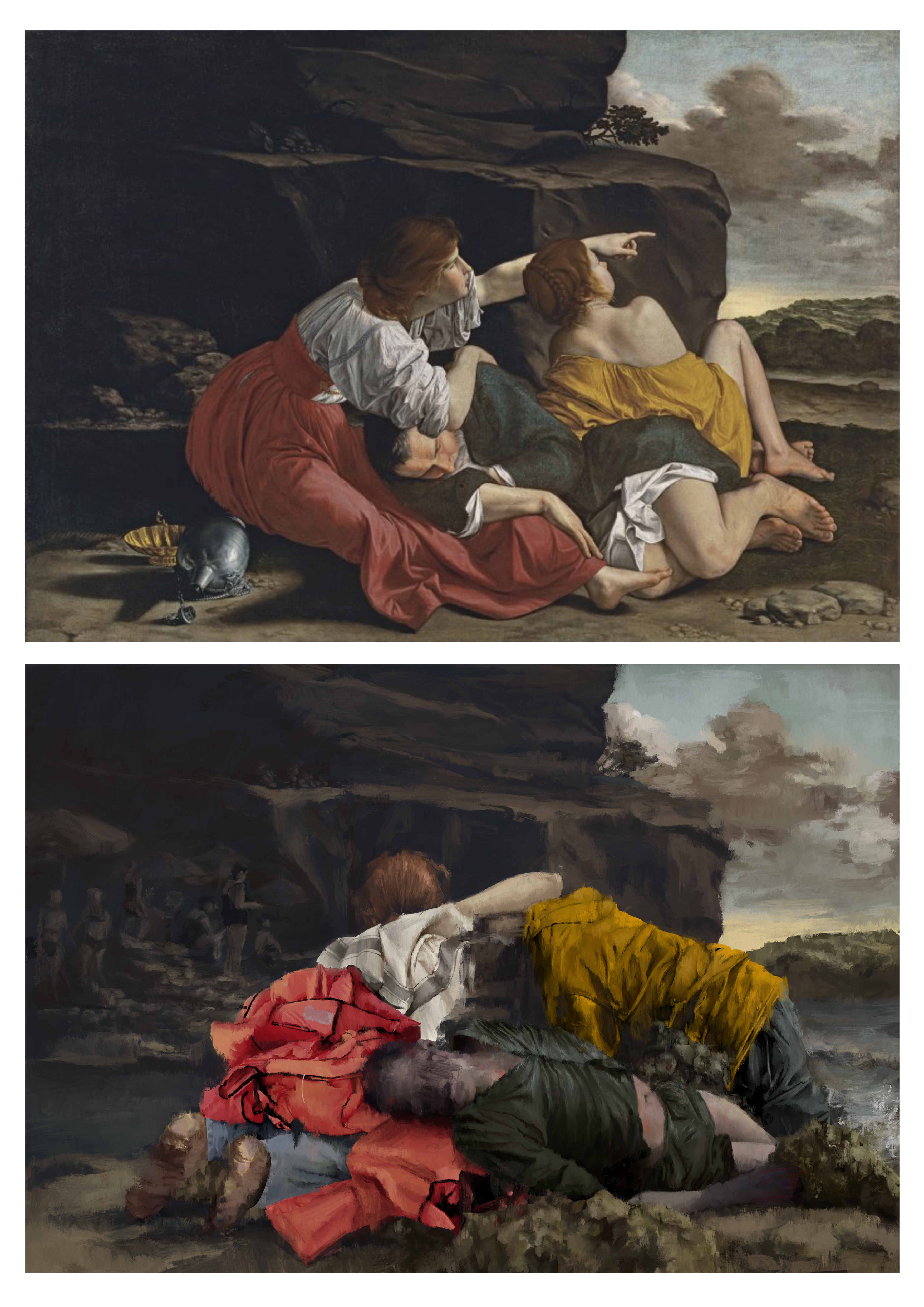 «Los hijos de mi hija» como versión de «Lot y sus hijas» de Orazio Gentileschi, 1622. El reclamo de un despertar social de la deshumanización que nos gobierna, en un momento en el que se registran las cifras más altas de muertes en rutas migratorias en todo el mundo. Una composición del siglo XVII que ha actuado como desencadenante de la confrontación entre muerte, lucha y abandono en una escena de playa bajo un mismo sol.