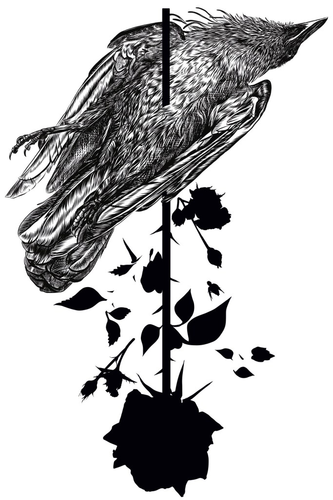 De aspecto más limpio y ordenado, surge Y de mis alas, al mismo tiempo que Para el asesinato de mis flores. En este caso, la ilustración ocupa la parte delantera al completo y, junto con la otra, forman un combo en blanco y negro apto para los amantes de la línea.